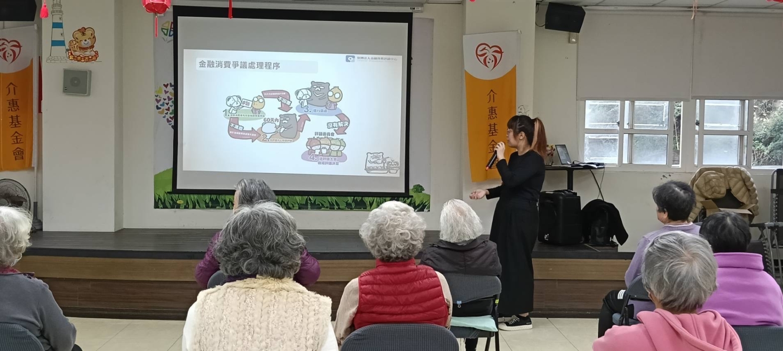 評議中心為提醒年長者守護自己的金融消費權益,以及避免財務剝削發生,與介惠社會福利慈善基金會合作辦理講座,希望建立正確的金融消費觀念,強化金融消費權益維護、財務剝削及詐騙防範的意識。現場與民眾進行QA問答及互動,反應熱烈。